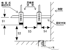 安裝要求示意圖如圖5所示,圖中S1表示檢測面與支架的間距,要求≥1Sn,S2表示檢測面與背景的間距,要求≥3Sn,S3表示并列安裝間距,要求≥5Sn,S4表示檢測面與側壁的間距,要求≥3Sn。(Sn為電容式接近開關的標準檢測距離)
