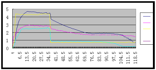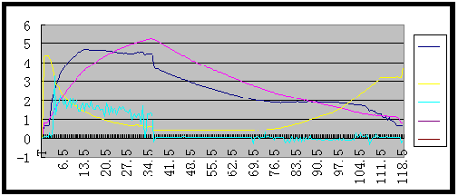圖4和圖5為汽車實際運行時電磁離合器電流和變速箱變比的關系曲線。其中圖4為汽車速度從零急加速到120KM/H,到120KM/H后松開油門減速到零時的電磁離合器電流與發(fā)動機轉速、節(jié)氣門開度和輸入軸轉速之間的曲線圖。由圖可以看出節(jié)氣門急加到最大后保持一段時間,電磁離合器電流同步緊跟著加,當加到峰值時,繼續(xù)保持不變,發(fā)動機轉速也加到一個值保持不變,從圖中還可看出電磁離合器電流在增加的過程中,不斷在抖動,可知在上升過程中電磁離合器在不斷在打滑,在此段時間內發(fā)動機轉速與輸入軸轉速不成比例,直到電磁離合器到一個穩(wěn)定的值后才保持一定的比例關系。當節(jié)氣門全松開后,電磁離合器電流隨之下降到一個小值后保持不變,直到車速達到使變速箱處于由齒輪變速為主時,電磁離合器電流繼續(xù)減小,當車速為零時,電磁離合器電流隨之減小到零。由圖4可知,當車速在從零加到120KM/H,電磁離合器電流為零,輸入軸轉速也慢慢減為零。在整個過程中,我們可看到,節(jié)氣門開度變化率代表了駕駛員的意圖,電磁離合器電流主要由節(jié)氣門開度來決定。電磁離合器的打滑程度決定了發(fā)動機轉速和輸入軸轉速的之間的傳輸比例關系。