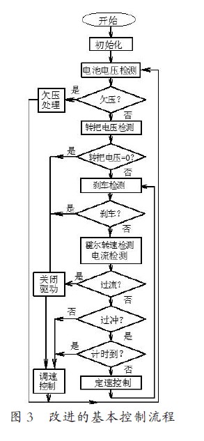 根據上述思路將軟件控制流程進行修改。如圖3 所示。將“速度增大而電流不增”作為“過沖”的判斷依據??刂破鞒掷m檢測速度變化和電流變化,再經過判斷,如果不屬于“過沖”的情況,則執行子程序“調速控制”。這種情況下控制器檢測轉把電壓值來調整PWM,增大或減小電流值使速度變化直至達到操作者通過轉把設定的速度值。