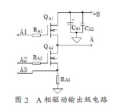 3)直流無刷電機的驅動控制:參見圖1,此電路采用三相無刷直流電機。3 個霍爾位置傳感器的空間間距為120o,輸出信號a、b、c最終送給單片機作為轉子位置檢測信號及測速信號。其中A 相末級電路如圖2 所示,在驅動電路中設置了電流檢測。單片機根據霍爾轉速信號和電流檢測信號,經過分析判斷,輸出正確的PWM 控制信號給相應的線圈通電,從而控制電動機的起動、停止及轉速等。