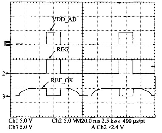 UVLO的啟動(dòng)電流測(cè)量值僅為17.8 A,實(shí)現(xiàn)了系統(tǒng)的低啟動(dòng)電流。系統(tǒng)上電和掉電的測(cè)試結(jié)果如圖11和圖12所示??梢娤到y(tǒng)在VDD的設(shè)置門限內(nèi)工作良好,REF-OK可以正確指示各個(gè)供電模塊正常工作。掉電過程正好相反。
