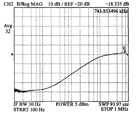 5 V 電壓的PSR測(cè)試波形如圖10所示。由此圖可見,其PSR可以達(dá)到-60 dB.該供電模塊在工作頻率為40~130 kHz的綠色多模式反激式控制器中的應(yīng)用表明,它對(duì)來(lái)自電源的干擾具有較好的抑制能力。
