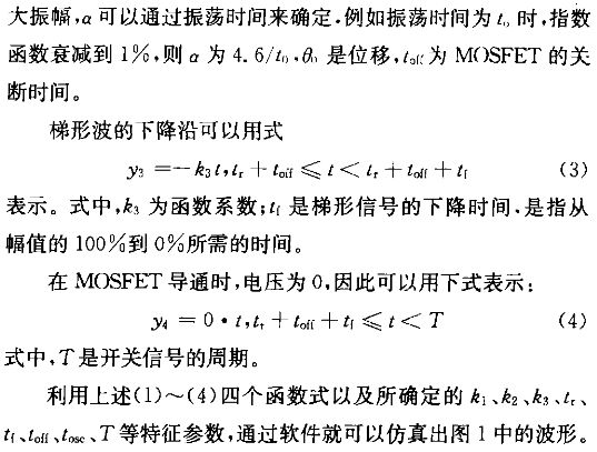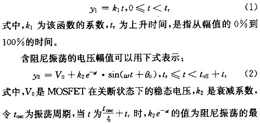 圖1中展示了一MOSFET的漏源極電壓波形,為了研究其上升時間、下降時間、阻尼振蕩等對其頻譜的影響,需要確定該波形的特征參數(shù),然后運用Matlab編程仿真。由于該波形是由一個梯形信號和一個阻尼振蕩信號疊加而成,因此可以用分段函數(shù)進行模擬。上升沿可以用式(1)表示。