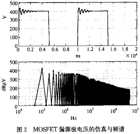 仿真時,由于傅立葉變換后各頻率點的幅值變化太大,研究工作非常困難,因此本文對傅立葉變換后的幅值進行了取對數(shù)處理,另外對1dBuV的值也進行了歸零。