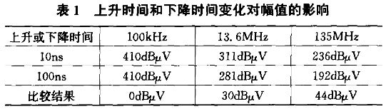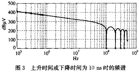 開關信號的上升和下降沿對干擾的幅值影響很大,圖3是上升時間或下降時間為10ns時的上升沿或下降沿的頻譜,把上升時間或下降時間改為100ns再仿真時發(fā)現(xiàn):當上升時間或下降時間增加時,隨著頻率的升高,幅值減小的越快,也就是說,上升或下降時間的變化對高頻干擾幅值影響更大。表1中列出了上升時間或下降時間為10ns和100ns時,不同頻率的電磁干擾幅值和比較結果。從圖中還可以看出在頻率為