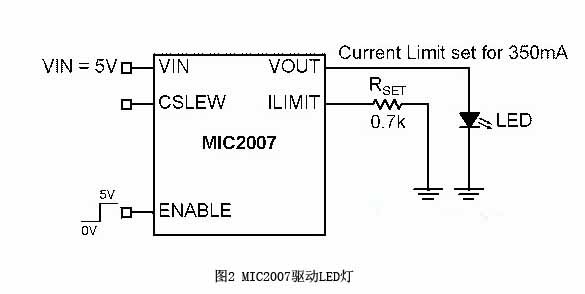 圖2展示的是輸出和LED相連的配電開關。MIC2007可以在2.5V-5.5V的輸入電壓下工作。它是通過外置電阻器Rset來設定限流值的。限流值等于CLF/Rset,CLF為限流因數,一般是245(請參考MIC2007數據表暨電氣性能表),而Rset 則等于0.7 kΩ。因此,限流值就是245/0.7 kΩ = 350 mA。