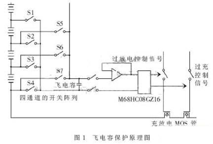 對于單體電池的檢測,主要采用飛電容技術。飛電容技術的原理圖如圖1所示,為電池組后4節(jié)的保護電路圖,通過四通道的開關陣列可以將后4節(jié)電池的任意1節(jié)電池的電壓采集到單片機中,單片機輸出驅動信號,控制MOS管的導通和關斷,從而對電池組的充電放電起到保護作用。