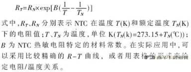 采用熱敏電阻作為溫度傳感器進行溫度采樣。熱敏電阻是一種熱敏性半導體電阻器,其電阻值隨著溫度的升高而下降。電阻溫度特性可以近似地用下式來表示: