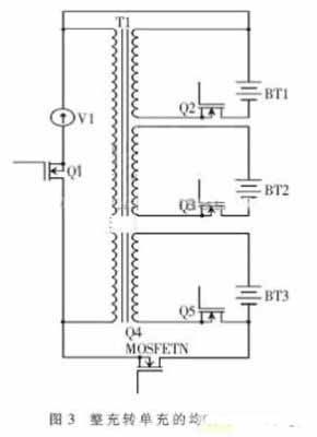 電池組常用的均衡方法有分流法、飛速電容均衡充電法、電感能量傳遞方法等。在本系統(tǒng)中,需要較多的I/O口驅動開關管,而單片機的I/O口有限,所以采取整充轉單充的充電均衡方法。原理圖如圖3所示。Q4是控制電池組整充的開關,Q2、Q3、Q5是控制單節(jié)電池充電的開關。以10節(jié)錳酸鋰電池組為例,變壓器主線圈兩端電壓為42 V,副線圈電壓為電池的額定電壓4.2 V。剛開始Q4導通,Q2、Q3、Q5截止,單節(jié)電池的電壓不斷升高,當檢測到某一節(jié)電池的電壓達到額定電壓4.2 V以后,電壓檢測芯片發(fā)出驅動信號,關閉Q4,打開Q2、Q3、Q5,整個系統(tǒng)進入單充階段,未充滿的電池繼續(xù)充電,以達到額定電壓的電池保持額定電壓不變。經測試,電壓差值不會超過50 mV。