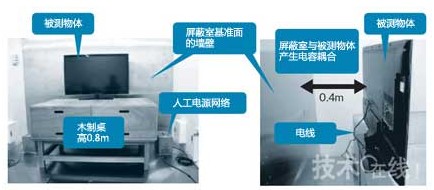 傳導噪聲的測量在屏蔽室內進行。測量條件由“CISPR16-2”或“ANSI63-4”等標準規(guī)定。兩種標準中規(guī)定,屏蔽室的基準面與被測物體的距離要保持在0.4m,連接人工電源網絡和被測物體的電線長度為0.8m,被測物體設置在高0.8m的臺子上(圖5)。
