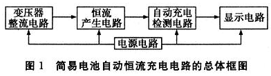 簡易電池自動恒流充電電路的總體框圖如圖1所示。它是由變壓器整流電路、恒流產(chǎn)生電路、自動斷電電路、顯示電路和電源電路5部分構成。