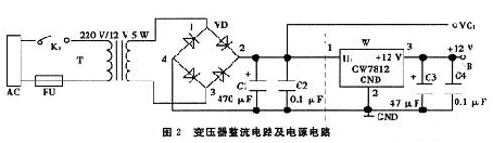 變壓器整流電路和穩(wěn)壓電源電路(如圖2虛線左邊所示),其主要由變壓器、二極管橋式電路、電容構成。其中變壓器采用常規(guī)的鐵心變壓器,并將公共電網(wǎng)中的220 V交流電變?yōu)?2 V交流電,再通過二極管橋式電路進行整流和電容C1濾波。整流信號由VC1引出。在此基礎上再接三端穩(wěn)壓器CW7812及電容C3、C4(如圖2虛線右邊所示),這樣整個電路就構成穩(wěn)壓電源電路。由B點提供+12 V的直流電壓。