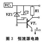 如圖3所示,由穩(wěn)壓管VZ1、晶體管VT1、電阻R1、電容C2構成的晶體管電流源提供恒定電流,取穩(wěn)壓管電壓為5 V,R1為51 Ω,此時IC≈1OO mA,作為電路的充電電流。