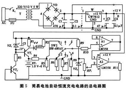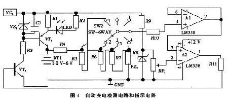 如圖4電路所示,自動斷電電路是由三極管VT2、電壓跟隨器A1、電壓比較器A2電阻R4、R5、R6、R7、R8、R11和可變電阻RP1構成。當充電開始時,電壓比較器輸出高電平,VT2導通,VT1也導通,指示燈發(fā)光二極管亮,給電池充電。可以先設定轉(zhuǎn)換開關為1時給一節(jié)電池充電,轉(zhuǎn)換開關為2時給二節(jié)電池充電,依次類推,實現(xiàn)對1-4節(jié)電池充電。當電充滿時,電壓比較器輸出低電平,VT2截止,VT1不導通,發(fā)光二極管熄滅,充電完畢。[page]