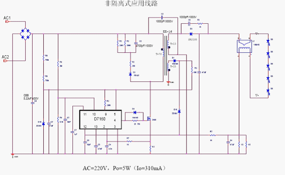 針對于無電解電容方案的LED驅(qū)動器的開發(fā),上海得倍電子也推出了一款D7160 是無電解電容的LED驅(qū)動IC。它無需電解電容,節(jié)省體積,可使印刷電路板面積縮小至原來的40%,提高整個LED燈具壽命,壽命可達(dá)10萬小時以上,綠色環(huán)保,白光LED能耗是普通節(jié)能燈的1/4,內(nèi)置抖頻減小EMI,內(nèi)置各種保護(hù)(過溫、欠壓閉鎖、過壓、過流),兼顧功率因數(shù)和輸出紋波,內(nèi)部具有一個30K--130K的壓控振蕩器,使得線路更加穩(wěn)定,效率更高并可以廣泛應(yīng)用于照明LED、射燈和日光燈之中。