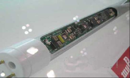 參考展示Clear Sodick生產(chǎn)的直管型LED照明產(chǎn)品,管內(nèi)內(nèi)置了電源電路,相當(dāng)于40W熒光燈的產(chǎn)品的耗電量為19W,LED元件數(shù)量為204個。