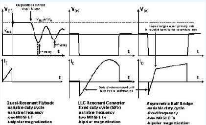 圖1所示為采用三種不同拓撲(準諧振反激式拓撲、LLC諧振拓撲和使用軟開關技術的非對稱半橋拓撲)的開關的電壓和電流波形。