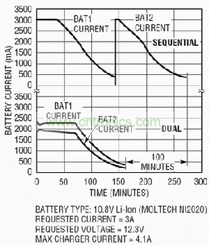 傳統上,雙電池系統是順序放電系統,允許順序消耗電池電量(先消耗電池1,再消耗電池2),以簡單地延長總的電池工作時間。LTC1760采用了專有模擬控制技術,可允許安全地對兩個電池并行充電或放電。圖1是一個采用LTC1760的雙電池系統的簡化原理圖。這種結構使充電速度提高了50%,電池工作時間延長了10%。此外,并行放電不僅增強了電流能力,而且還降低了I2R損耗并改善了在極高負載條件下的電壓調節能力。降低I2R損耗和改善電壓調節都延長了時序解決方案的總放電時間(見圖2)。