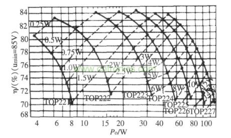 在設計開關電源時,首先就要面臨如何選擇合適的開關電源控制芯片。在選擇芯片的時候,要既能滿足要求,又不因為選型造成資源的浪費。下面就介紹利用TopswitchⅡ系列開關電源的功率損耗( PD ) 與電源效率(η),輸出功率( Po ) 關系曲線,快速選擇芯片的型號,從而完成寬范圍輸入的通用開關電源的設計。