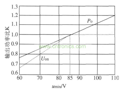 PD ,η, Po 關系曲線均對交流輸入電壓的最小值進行了限制,umin = 85 V.如果交流輸入電壓最小值不符合上述的要求,就會直接影響芯片的正確選擇。此時必須從實際的交流輸入電壓u? min最小值對應的功率P''o 折算成umin為規定值時的等效功率Po,才能使用上面的圖。功率修正的方法如下: 選擇使用的特性曲線,然后根據已知的u''min值查出折算系數K;將P ''o折算成umin為規定值時的等效功率Po,表達公式P o=P''o / K;然后從圖3、圖4 中選用適當的關系曲線。