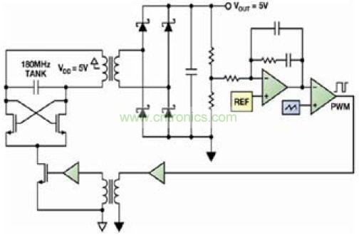 微變壓器可以用于提供集成的信號和電源隔離,最大額定值為5 kV rms [1]。對于信號傳輸,輸入數(shù)據(jù)通常在編碼之后再傳輸給數(shù)據(jù)變壓器原邊。副邊則通過解碼來還原信號。輸入與輸出之間的隔離通過初級線圈與次級線圈之間的絕緣層來實現(xiàn)。為了在隔離之間實現(xiàn)高效的電源傳輸,用一個自振高頻振蕩器來驅(qū)動電源變壓器的原邊,同時用高頻肖特基二極管來提供整流直流電壓。調(diào)節(jié)由次級控制器產(chǎn)生的PWM完成,該PWM通過一個反饋變壓器以遠低于振蕩頻率的頻率來開啟和關(guān)閉振蕩器,如圖2(a)所示。通過反饋變壓器的反饋信號的工作方式與通過數(shù)據(jù)變壓器