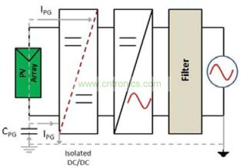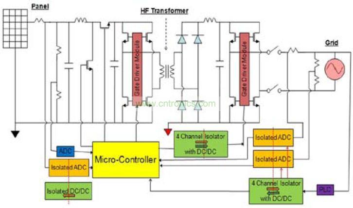 市場上主要有兩類PV逆變器,即無變壓器逆變器和變壓器隔離逆變器。無變壓器逆變器可能會受到大接地漏電流和注入的直流的影響,因為PV電池板與交流網(wǎng)之間存在很大的電池板電容而且缺少隔離,如圖1(a)所示。如果有直流組分注入電網(wǎng)中的交流電流中,這種情況是應(yīng)該避免的,因為結(jié)果可能導(dǎo)致配電變壓器飽和。許多安全標準對電網(wǎng)中注入的直流電流量進行了嚴格的規(guī)定,有些情況下,必須對變壓器進行隔離。在電池板與電網(wǎng)之間采用變壓器隔離技術(shù)可以消除因電池板相對于電網(wǎng)的電壓差而產(chǎn)生的直流注入路徑,如圖1(b)所示。除直流注入以外,并網(wǎng)逆變器還需滿足電網(wǎng)的其他要求,比如總諧波失真和單諧波電流水平、功率系數(shù)以及孤網(wǎng)運行情況的檢測等。電網(wǎng)電壓和注入電網(wǎng)的電流必須精確監(jiān)控。如果用于執(zhí)行MPPT和柵極驅(qū)動功能的控制器位于電池板一端,則必須將這些測量值隔離開來。為了使PV電池板發(fā)揮最大效率,需采用最大功率點跟蹤(MPPT)算法。為了實現(xiàn)MPTT,還需監(jiān)控電池板電壓和電流。當人們嘗試串聯(lián)多個PV逆變器以減少所需逆變器的數(shù)量時,電池板電壓可能變得非常高。從PV電池板高邊端進行的電流測量也需要隔離。除了隔離電流和電壓測量以外,還需要RS-485、RS-232和CAN等接口功能。RS-485或RS-232一般用于面向這些PV逆變器的通信,以獲得實時的性能數(shù)據(jù),而通信總線則需要進行隔離,因為總線需要傳輸較長的距離,同時也是出于安全考慮。對于通信距離較短時,也可使用隔離CAN。這些收發(fā)器也需要把隔離電源從電池板一端抽取至總線一端。