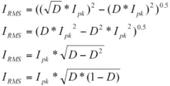 下面是輸入電容中RMS電流的推導(dǎo)過程,其假設(shè)電感無窮大。它以矩形脈沖(D0.5*Ipk)的RMS電流作為開始,并去除了DC組件(D*Ipk)。