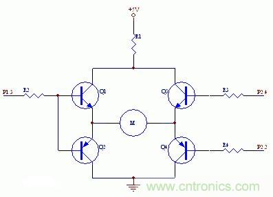 如下圖所示,些電路是作者最初設(shè)計的電路,P1.3、P2.2和P2.4分別是51單片機的IO引腳。設(shè)計的工作原理是:當(dāng)P1.3高電平、P2.2和P2.4都為低電平時,電機正轉(zhuǎn)。此時,Q1和Q4導(dǎo)通,Q2和Q3截止,電流注向為+5VàR1àQ1àMàQ4;當(dāng)P1.3低電平、P2.2和P2.4都為高電平時,電機反轉(zhuǎn)。此時,Q2和Q3導(dǎo)通,Q1和Q4截止。P2.2為高電平同時P2.4為低電平時,電路全不通,電機停止。圖中電阻:R1=20Ω,R2=R3=R4=510Ω
