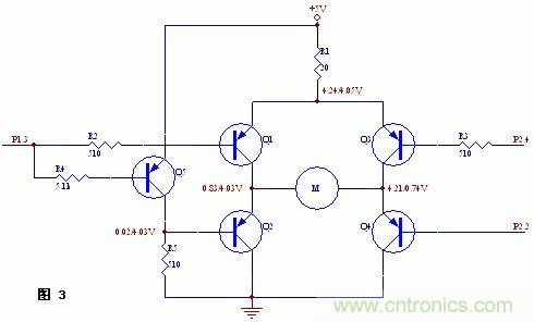 但實際實驗情況去出人意料,即電機正向和反向都不轉(zhuǎn)。經(jīng)測量,當(dāng)P1.3高電平,P2.2和P2.4都為低電平時,Q4導(dǎo)通,但Q1不導(dǎo)通,P1.3的電平只有0.67V左右,這樣Q1無法導(dǎo)通。