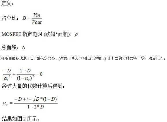 通過圖1,我們知道50%轉(zhuǎn)換比率時出現(xiàn)最佳傳導(dǎo)損耗極值。但是,在其他轉(zhuǎn)換比率條件下,可以將損耗降至這一水平以下。附錄給出了進(jìn)行這種優(yōu)化的數(shù)學(xué)計算方法,而圖2顯示了其計算結(jié)果。即使在極低的轉(zhuǎn)換比率條件下,F(xiàn)ET芯片面積的很大一部分都應(yīng)該用于高側(cè)FET。高轉(zhuǎn)換比率時同樣如此;應(yīng)該有很大一部分面積用于低側(cè)。這些結(jié)果是對這一問題的初步研究,其并未包括如高側(cè)和低側(cè)FET之間的各種具體電阻值,開關(guān)速度的影響,或者對這種芯片面積進(jìn)行封裝相關(guān)的成本和電阻等諸多方面。但是,它為確定FET之間的電阻比提供了一個良好的開端,并且應(yīng)會在FET選擇方面實現(xiàn)更好的整體折中。