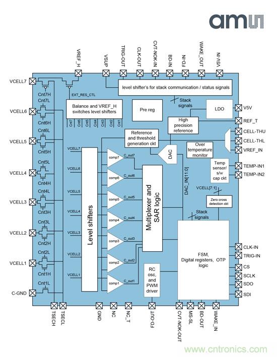 奧地利微電子開發的新架構使用高集成的新款芯片——AS8506,該架構為堆疊電池模塊帶來電量監測和均衡操作,包括安全操作區域(SOA)檢查以及主動或被動電量均衡。該架構是各類鋰電池的理想選擇,比如混合動力車和全電動汽車儲能系統中的電池以及電子雙電層電容器(又被稱為超級電容器 )。