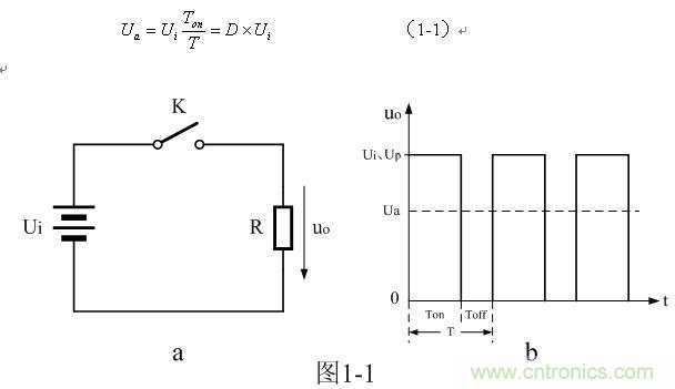 圖1-1-a是串聯式開關電源的最簡單工作原理圖,圖1-1-a中Ui是開關電源的工作電壓,即:直流輸入電壓;K是控制開關,R是負載。當控制開關K接通的時候,開關電源就向負載R輸出一個脈沖寬度為Ton,幅度為Ui的脈沖電壓Up;當控制開關K關斷的時候,又相當于開關電源向負載R輸出一個脈沖寬度為Toff,幅度為0的脈沖電壓。這樣,控制開關K不停地“接通”和“關斷”,在負載兩端就可以得到一個脈沖調制的輸出電壓uo 。