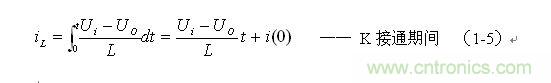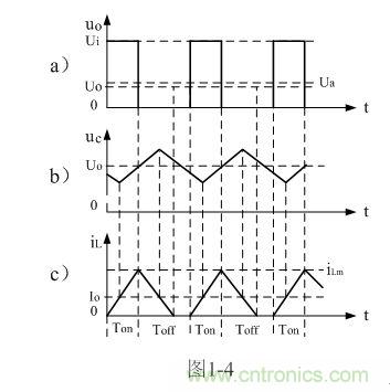 在此順便說明:由于電容兩端的電壓變化量ΔU相對于輸出電壓Uo來說非常小,為了簡單,我們這里把Uo當成常量來處理。在某種情況下,當我們需要對電容的初次充、放電過程進行分析時,必須需要建立微分方程,并求解。當開關電源剛開始工作時,由于輸出電壓Uo的建立需要一定的時間,因此,輸出電壓Uo的建立也需要一個過渡過程,如對此過渡過程進行精確計算,得出的結果中一般都含有一指數函數項,當令時間變量等于無窮大時,即電路進入穩態時,再對相關參量取平均值,其結果就基本與(1-4)相等。