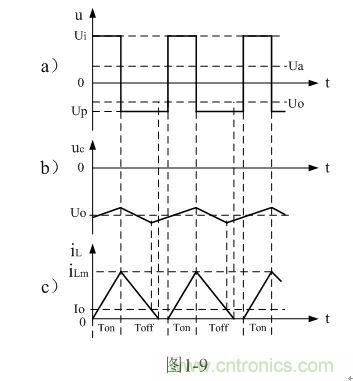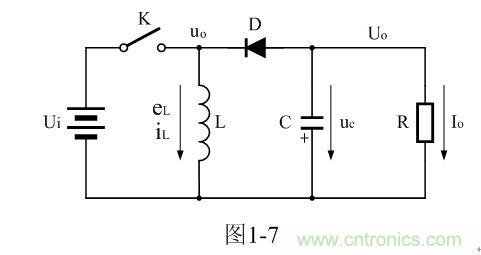 圖1-7中,Ui為輸入電源,K為控制開關,L為儲能電感,D為整流二極管,C為儲能濾波電容,R為負載電阻。當控制開關K接通的時候,輸入電源Ui開始對儲能電感L加電,流過儲能電感L的電流開始增加,同時電流在儲能電感中也要產生磁場;當控制開關K由接通轉為關斷的時候,儲能電感會產生反電動勢,使電流繼續流動,并通過整流二極管D進行整流,再經電容儲能濾波,然后向負載R提供電流輸出??刂崎_關K不斷地反復接通和關斷過程,在負載R上就可以得到一個負極性的電壓輸出。