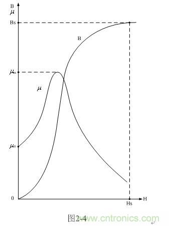 圖2-4是變壓器鐵芯導磁率和磁感應強度對應磁場強度變化的曲線圖。圖中,曲線B為磁感應強度對應磁場強度變化的關系曲線,曲線