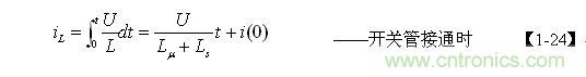 假設變壓器初級線圈的等效電感為L,L=Lu+Ls ,當電源開關管Q1接通時,流過變壓器初級線圈的電流為: