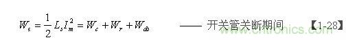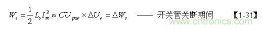 如果不考慮電阻R對電容器C充電時產(chǎn)生的分流作用,以及開關管由導通到完全關斷期間漏極電流(逐步減小)對電容器C充電時產(chǎn)生的分流作用,即:Wr=0 、Wds=0 ,則【1-28】式可以改寫為:
