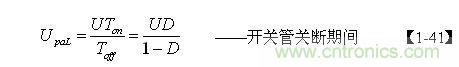 【1-41】式中,U為電源輸入電壓,Ton為電源開關管的導通時間,Toff為電源開關管的關斷時間,D為占空比。而Upau可根據(jù)漏感Ls 與開關變壓器初級線圈的電感L的比值k求得。
