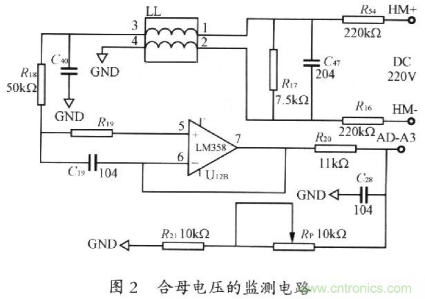 合母電壓監測電路如圖2所示。合母電壓流過電阻R16、R17、R54,在電阻R17上取樣,故而電阻R17應選用高精度電阻。R16和R54因為要比電阻R17大得多,又是出現在分母上,故而不必選用高精度電阻。LL的作用是抑制共模干擾。可以通過調節電位器Rp的大小來使所要監測電壓的大小符合A/D轉換器輸入電壓要求。