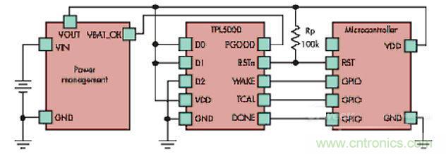新式解決方案采用針對(duì)長(zhǎng)休眠期特制的定時(shí)裝置,德州儀器TPL5000具備可編程分配器,提供最高間隔64秒的蘇醒脈沖,運(yùn)作時(shí)用電量?jī)H30nA,在極長(zhǎng)休眠周期下,最多能為電池供電的無(wú)線傳感器延長(zhǎng)兩年使用年限。(請(qǐng)見下圖)