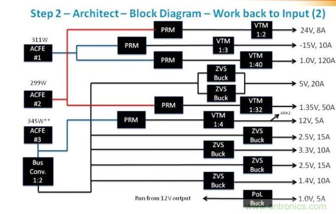 圖5:在這里,我們看到現(xiàn)在引入了驅(qū)動(dòng)電壓軌的ACFE。這里非常重要的是判斷每路電壓軌上的負(fù)載,并確保負(fù)載均操作于接近具有合適安全裕度的最大值。