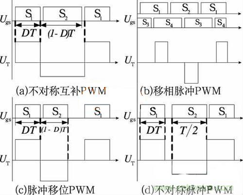 下面我們來具體說一下控制型軟開關PWM控制策略,它是指控制型軟開關半橋DC/DC變換器不增加主電路元器件(可增加電感電容元件以實現(xiàn)軟開關條件),通過合理設計控制電路來實現(xiàn)軟開關。圖2給出4種控制型軟開關半橋DC/DC變換器的PWM控制策略。
