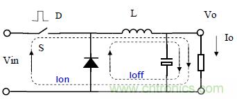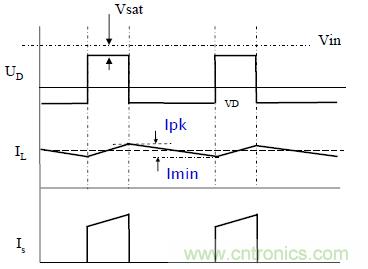 在這階段,電流波形是一條斜率為負的斜線,斜率為-Vout/Lo。當(dāng)開關(guān)再次導(dǎo)通時,二極管迅速關(guān)斷,電流從輸入電源和開關(guān)管流過。在開關(guān)導(dǎo)通前瞬間,電感上的電流Imin就是開關(guān)管通過的初始電流。