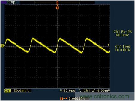 以安森美NCV4949來講,在其輸出端加一個10uF的陶瓷電容,在電容后端測量到的瞬態(tài)響應(yīng)如圖(AC mode):