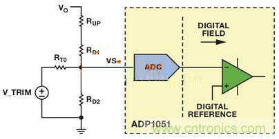 考慮整個控制環路,輸出電壓通過電壓分壓器或者運算放大器縮放到合適的值,然后輸入給VS+引腳。ADC對該電壓進行采樣。數字內核知道數字化的輸出電壓值只采用邏輯電平信號工作,因此無法使用外部基準電壓并旁路內部比較器和濾波器。受限于這種固定的硬件配置,向后兼容現有模擬調整功能的唯一途徑是調節VS+引腳上的ADC檢測電壓。一種方法是重新配置反饋網絡。