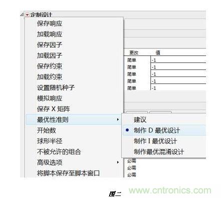篩選設(shè)計(jì)是指在問(wèn)題研究的早期,潛在的候選因素很多,如何有效地大規(guī)模降低實(shí)驗(yàn)次數(shù)而又準(zhǔn)確地找到少數(shù)幾個(gè)影響發(fā)動(dòng)機(jī)性能的關(guān)鍵因素。具體的實(shí)現(xiàn)手段有兩種:一種是經(jīng)典的實(shí)驗(yàn)設(shè)計(jì)方法,如部分析因設(shè)計(jì)、Plackett-Burman設(shè)計(jì)等(如圖一所示);另一種是高級(jí)的實(shí)驗(yàn)設(shè)計(jì)方法,如D最優(yōu)設(shè)計(jì)等(如圖二所示)。