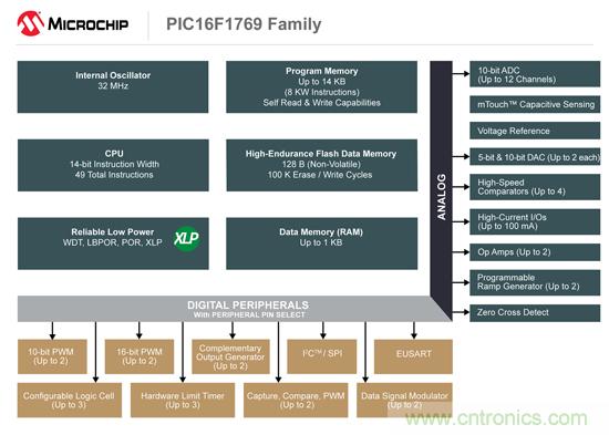 Microchip MCU8部門副總裁Steve Drehobl表示:“PIC16F1769系列真正強大的功能在于能夠實現片上外設的互連,從而根據特定的應用來創建定制化功能。再加上能夠同時控制獨立閉環通道,新產品的功能遠遠超出了傳統低成本8位 PIC MCU。”