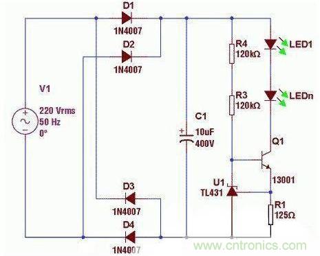這種電路的原理非常簡單,主要利用了431的2.495V的基準來做恒流,并且同樣限制了LED上面的壓降,但優點與缺點同樣明顯。