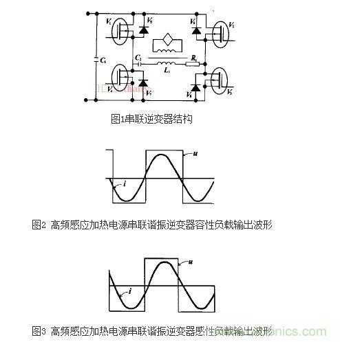 作為高頻感應(yīng)加熱電源設(shè)備的重要組成部分,串聯(lián)諧振逆變器在工作中具有損耗低、工作適應(yīng)性良好等優(yōu)勢。這種逆變器在實(shí)際應(yīng)用中也被稱為電壓型逆變器,其基礎(chǔ)結(jié)構(gòu)的原理圖如圖1所示。在實(shí)際工作的過程中,串聯(lián)諧振型逆變器的輸出電壓為近似方波。由于電路工作在諧振頻率附近,使振蕩電路對于基波具有最小阻抗,所以負(fù)載電流ia近似正弦波。同時,為避免逆變器上、下橋臂間的直通,換流必須遵循先關(guān)斷后導(dǎo)通的原則,在關(guān)斷與導(dǎo)通間必須留有足夠的死區(qū)時間。下圖中的圖2和圖3分別示出容性負(fù)載和感性負(fù)載的輸出波形。