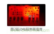 有時,電路參數和性能看似正常,但實際上隱藏很大的問題。如圖 2所示,某電路基本性能沒有問題,但在常溫下,用紅外熱成像儀一測,不得了了,MOS管的驅動電阻表面溫度居然達到95.2℃。長期工作或高溫環境下,極易出現電阻燒壞、模塊損壞的問題??梢?,研發過程中使用熱成像儀測試元器件的溫度尤其重要,可及時發現并定位問題點。通過調整電路參數,降低電阻的歐姆熱損耗,且將電阻封裝由0603改成0805,大大降低了表面溫度。